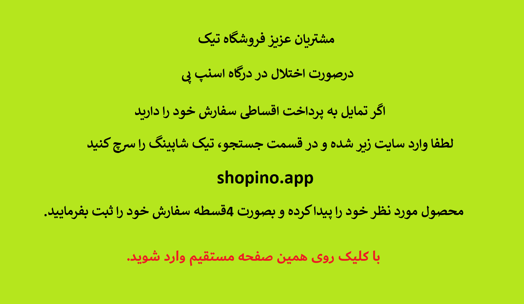 درصورت اختلال در "درگاه اسنپ پی"، اگر تمایل به "پرداخت اقساطی" دارید میتوانید وارد سایت shopino.app شده و در قسمت جستجو (تیک شاپینگ) را سرچ کنید و یا روی همین قسمت کلیک کنید.