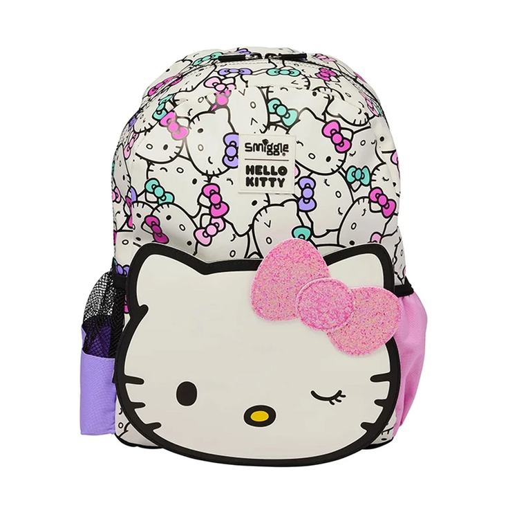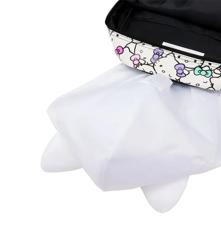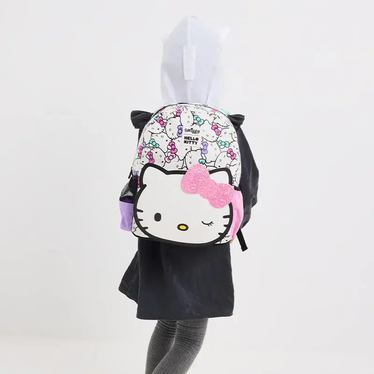 این کوله پشتی دارای بندهای نرم و قابلتنظیم از فوم برای حمل آسان بوده و در پشت کوله زیپی ویژه تعبیه شده که یک کلاه کاپشنی با گوش و پاپیون طرح کیتی درون آن قرار دارد. بدنهی مقاوم در برابر سایش و پارگی، ساختار داخلی جادار و جیبهای کناری برای بطری یا لوازم شخصی، استفادهای راحت و طولانیمدت را ممکن ساخته است.