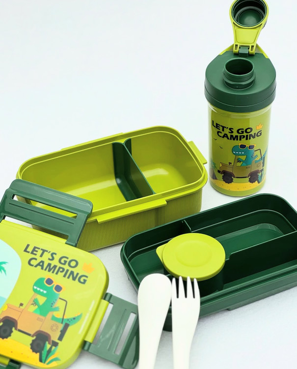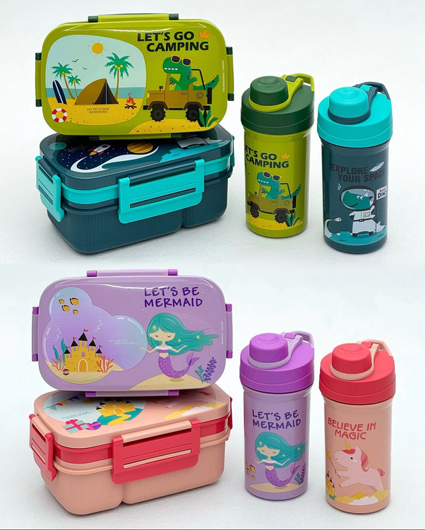 اندازه: ابعاد ظرف غذا: طول 21.8، عرض 14، ارتفاع 10.5 سانتیمتر - ابعاد قمقمه: طول 10، عرض 10، ارتفاع 18 سانتیمتر